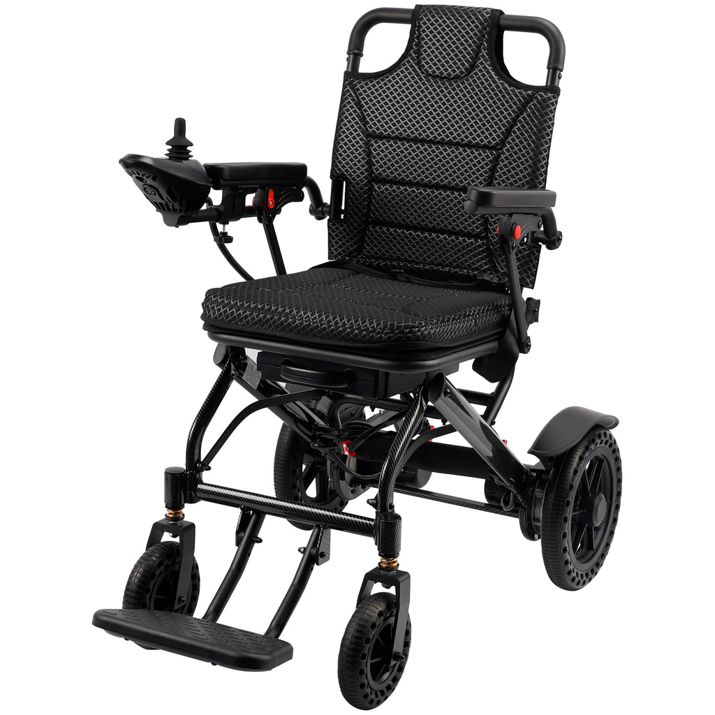 Powerful Performance:Powered by a 6Ah lithium battery, the wheelchair has a standard range of up to 10 km. It features 360W motors for smooth and efficient movement across various terrains, with front 6-inch and rear 12-inch solid wheels.