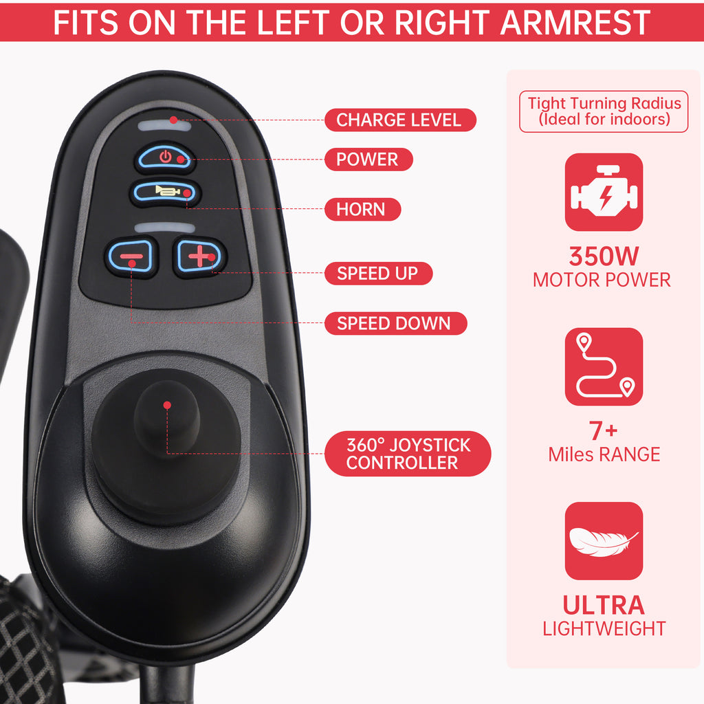 【Powerful motor is easy to use】: Combining power, efficiency and compact size, the rugged motor delivers outstanding performance on all-terrain roads, even with a 220-pound load capacity. Plus, the responsive 360 joystick makes maneuvering and braking easy, even in tight spaces.